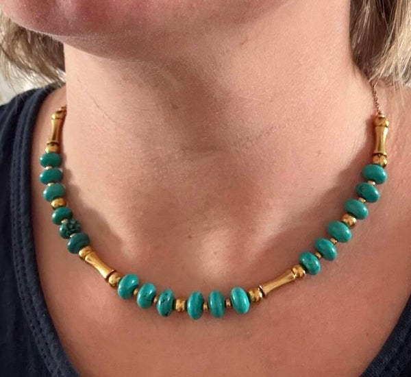 Die Verbindung von Türkis und Gold vereint Schutz, Licht und Herzensenergie. Die Kette wirkt wie ein energetisches Feld, das dich an dein eigenes Licht erinnert und dich stärkt, authentisch und klar deinen Weg zu gehen.
